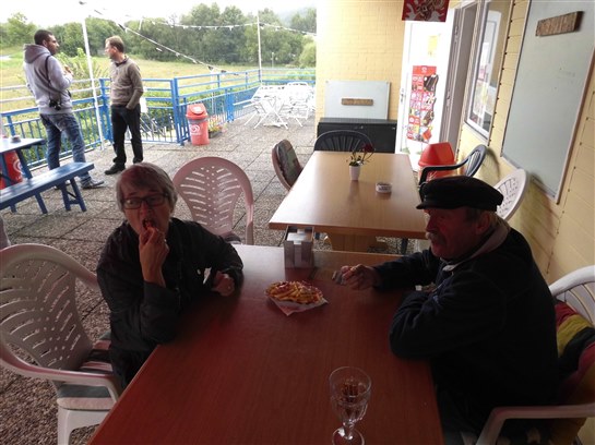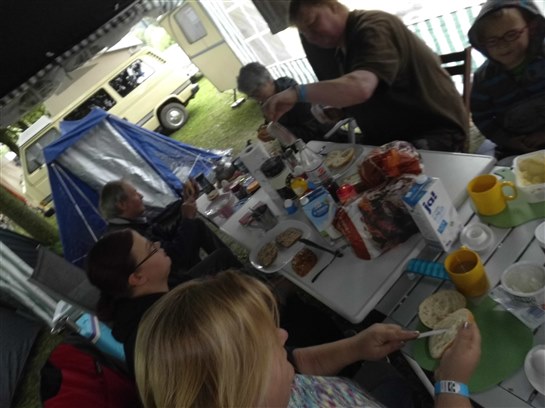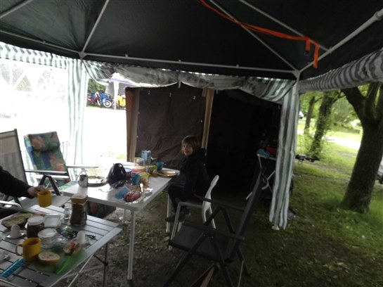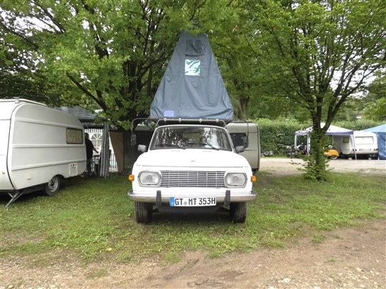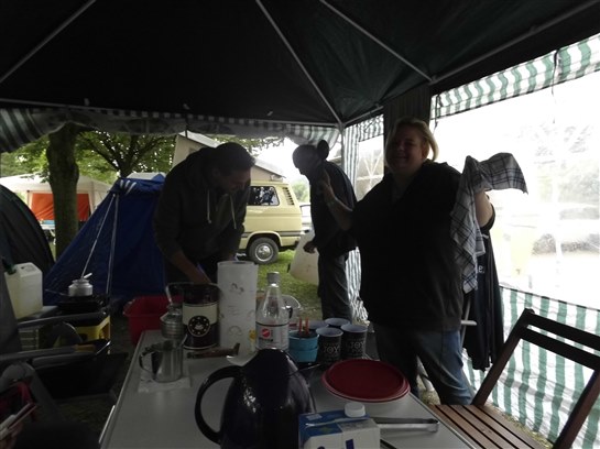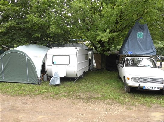 Nachdem wir Freitag im Regen und durch unzählige Umleitungen angereist waren, konnten wir im Trockenen unsere Wohnwagen und Zelte aufbauen.